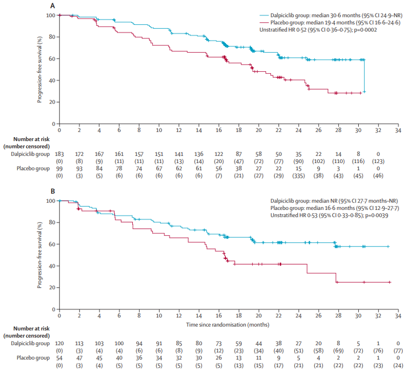 DAWNA-2研究在期中分析时达到其主要终点。达尔西利+来曲唑/阿那曲唑的中位PFS为30.6个月(95% CI: 30.6-未达到[NR]),安慰剂+来曲唑/阿那曲唑为18.2个月(95% CI: 16.5-22.5),联合达尔西利治疗延长了12.4个月的PFS,降低疾病进展或死亡风险49%(HR=0.51;95% CI: 0.38-0.69,P<0.0001)。研究者评估的PFS与BIRC评估的PFS相似(NR vs 22.5个月,HR=0.50)。