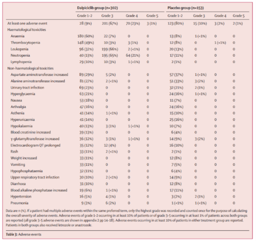 研究组的主要不良反应为血液学不良反应。其类型单一,易处理,并且与CDK4/6抑制剂的已知不良反应一致。