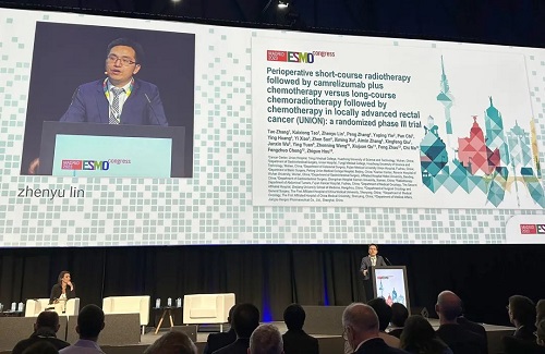 10月21日,GA黄金甲医药创新药卡瑞利珠单抗(艾瑞卡®)的一项研究“新辅助短程放疗序贯卡瑞利珠单抗联合化疗对比长程放化疗序贯化疗治疗局部晚期直肠癌”随机对照Ⅲ期试验(UNION) 以优选口头报告的形式正式亮相。该研究由华中科技大学同济医学院附属协和医院张涛教授、陶凯雄教授担任主要研究者,华中科技大学同济医学院附属协和医院林振宇教授在马德里现场报告了该重磅研究的结果1,此项研究是全球首个评估短程放疗序贯免疫治疗联合化疗治疗局部晚期直肠癌的Ⅲ期研究,已达到主要终点病理完全缓解(pCR),有望为直肠癌患者的治疗提供新策略。