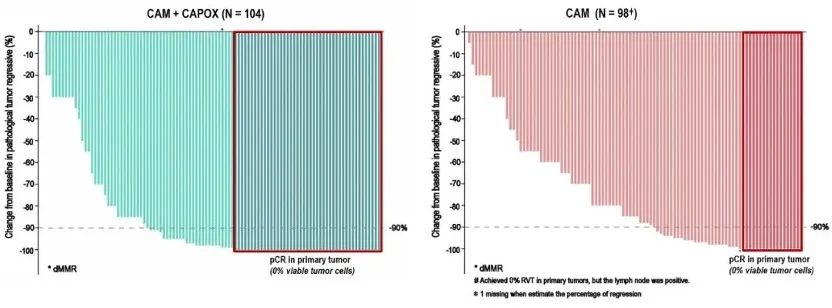 CAM + CAPOX组的中位肿瘤退缩率达到98%,CAPOX组为85%(图4)。