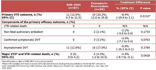 基于改良意向性治疗集(mITT),SHR-2004组87例受试者中有11例(12.6%)发生VTE,阳性对照组94例受试者中有19例(20.2%)发生VTE,VTE发生率的组间率差为-8.4%(95% CI,-19.9~3.1;非劣效p值为0.0110)。SHR-2004组无受试者发生重大VTE(包括非致死性PE和近端DVT)或VTE相关死亡,而阳性对照组中有4例(4.3%)受试者发生重大VTE或VTE相关死亡,组间率差为-4.4%(95% CI, -8.7 ~ -0.1;p=0.0428)。