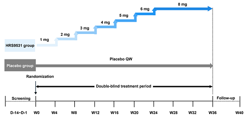 这是一项多中心、随机、双盲、安慰剂对照的Ⅱ期研究(临床试验注册号:NCT06054698)。研究纳入BMI为28.0–40.0 kg/m²,或BMI为24.0–28.0 kg/m²且至少伴有一种体重相关合并症的中国成年参与者,随机分配接受每周一次皮下注射HRS9531(通过剂量滴定方式给药至8 mg)或安慰剂治疗。治疗周期为36周,包括24周剂量递增期和12周8 mg剂量维持期。主要终点是第36周时体重相对基线的百分比变化。