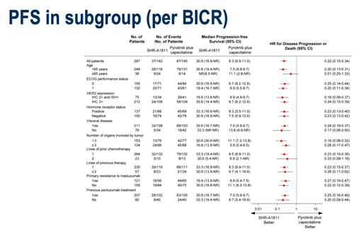 PFS亚组分析结果方面,所有亚组均可从瑞康曲妥珠单抗治疗中获益。