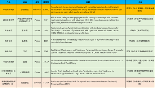 在头颈肿瘤、乳腺癌、肺癌、前列腺癌等多个疾病领域,卡瑞利珠单抗、阿得贝利单抗、吡咯替尼、氟唑帕利、法米替尼、醋酸阿比特龙片(II)等抗肿瘤新药相关研究一共入选了1项简短口头报告、4项壁报展示和1项电子壁报,彰显了GA黄金甲医药强劲的研发实力。